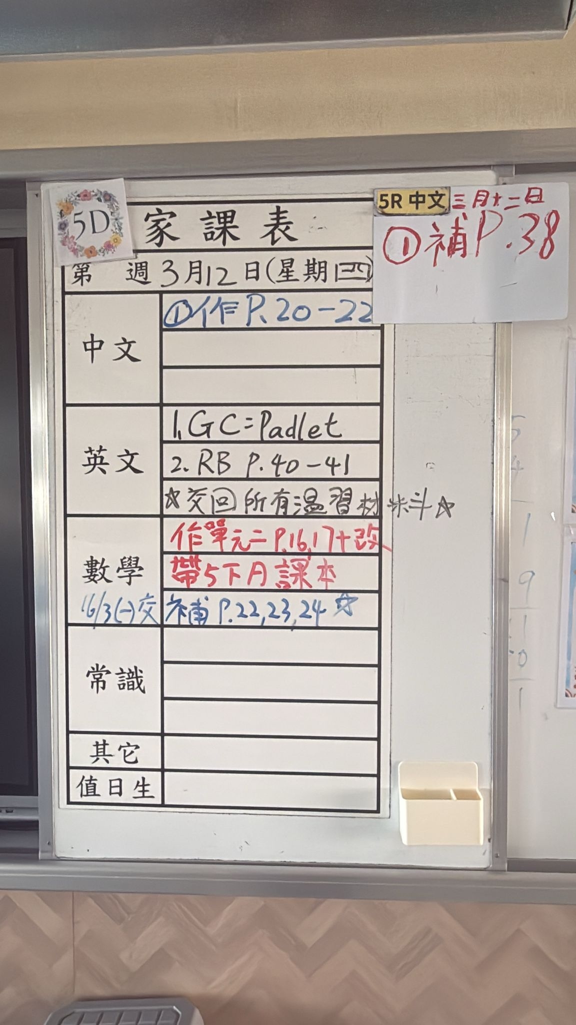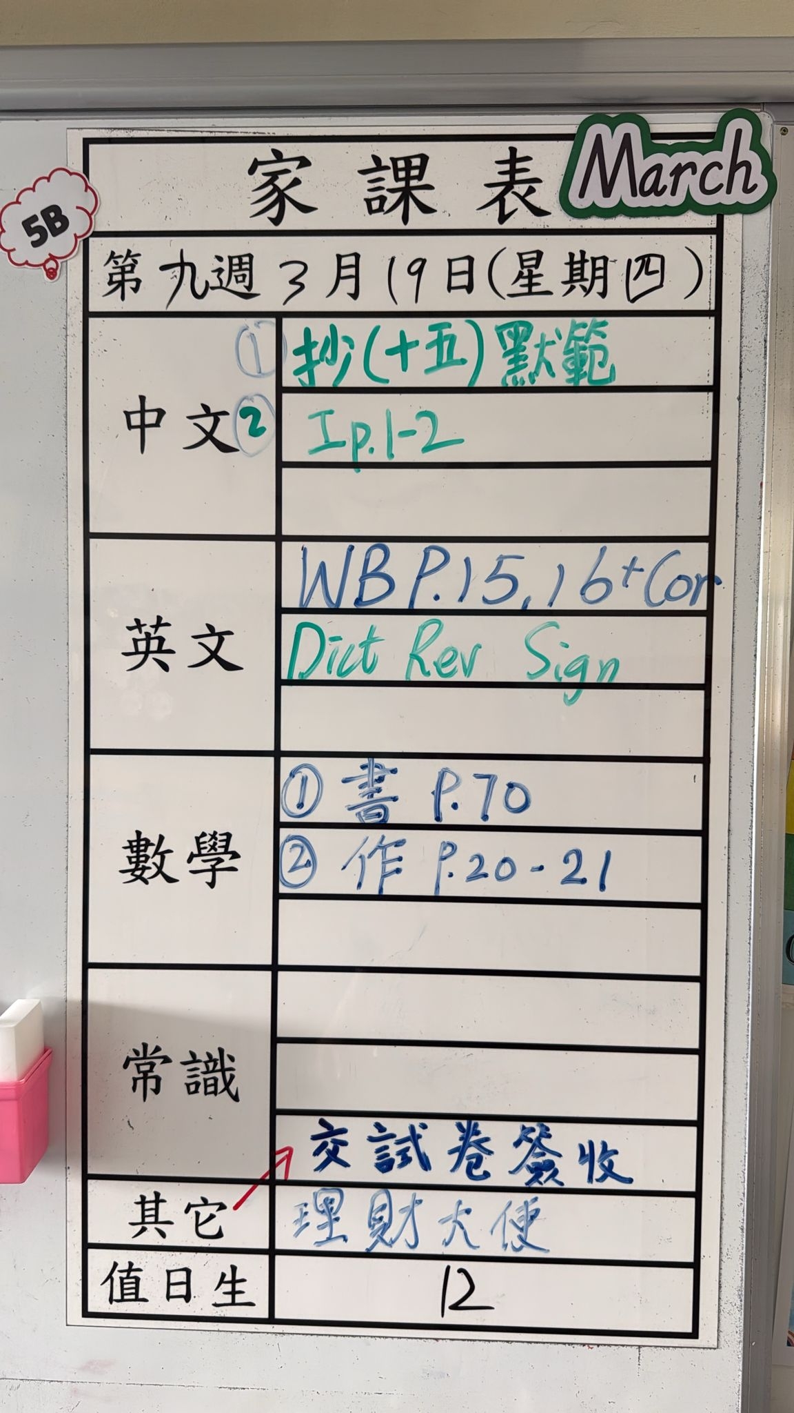 2026-03-12 週四發出之家課: