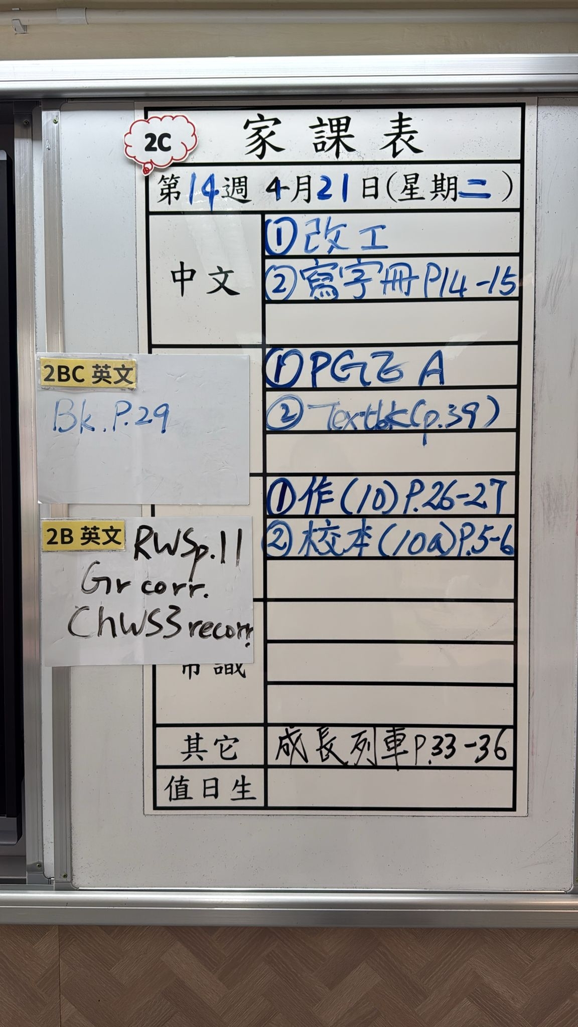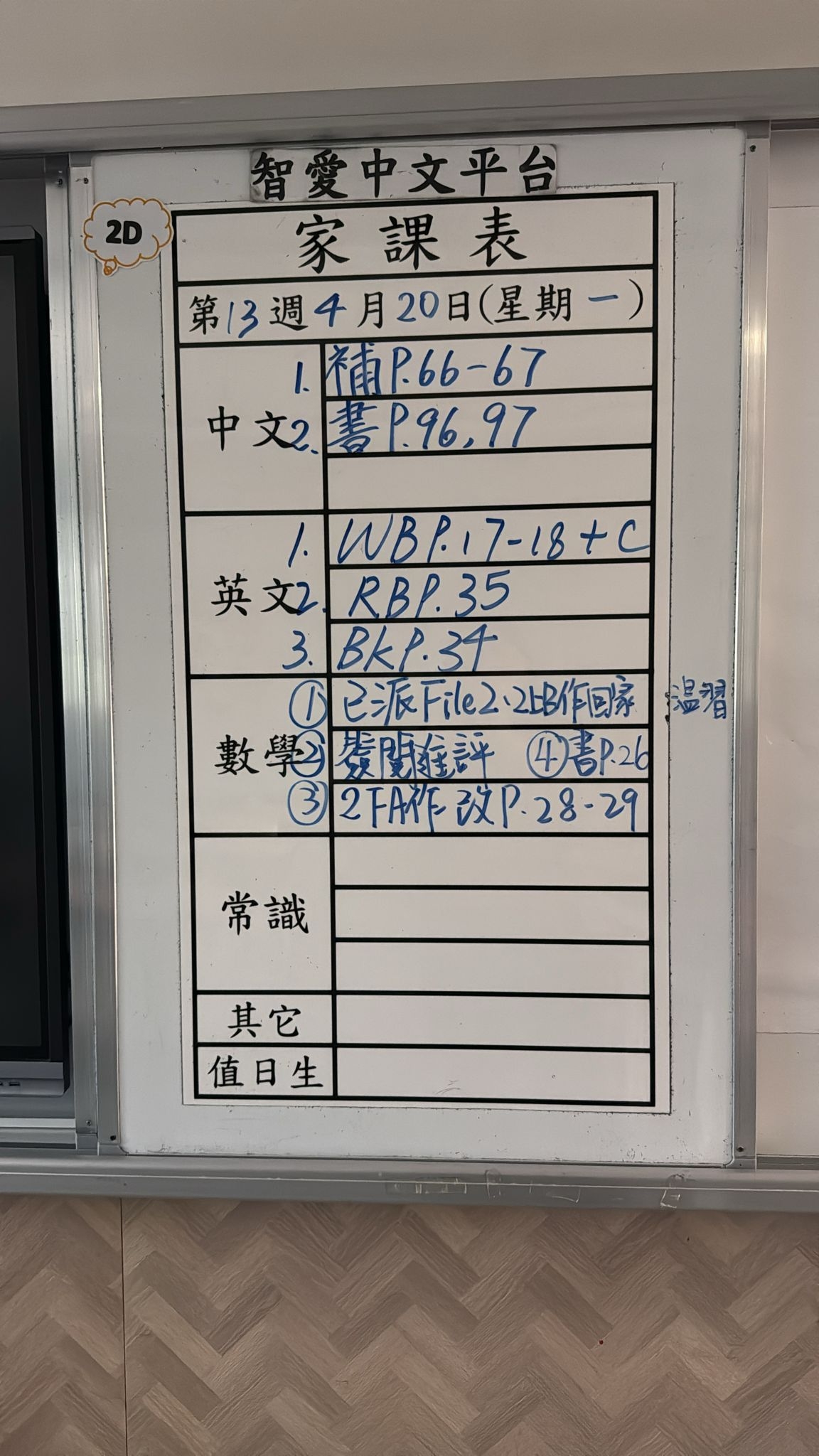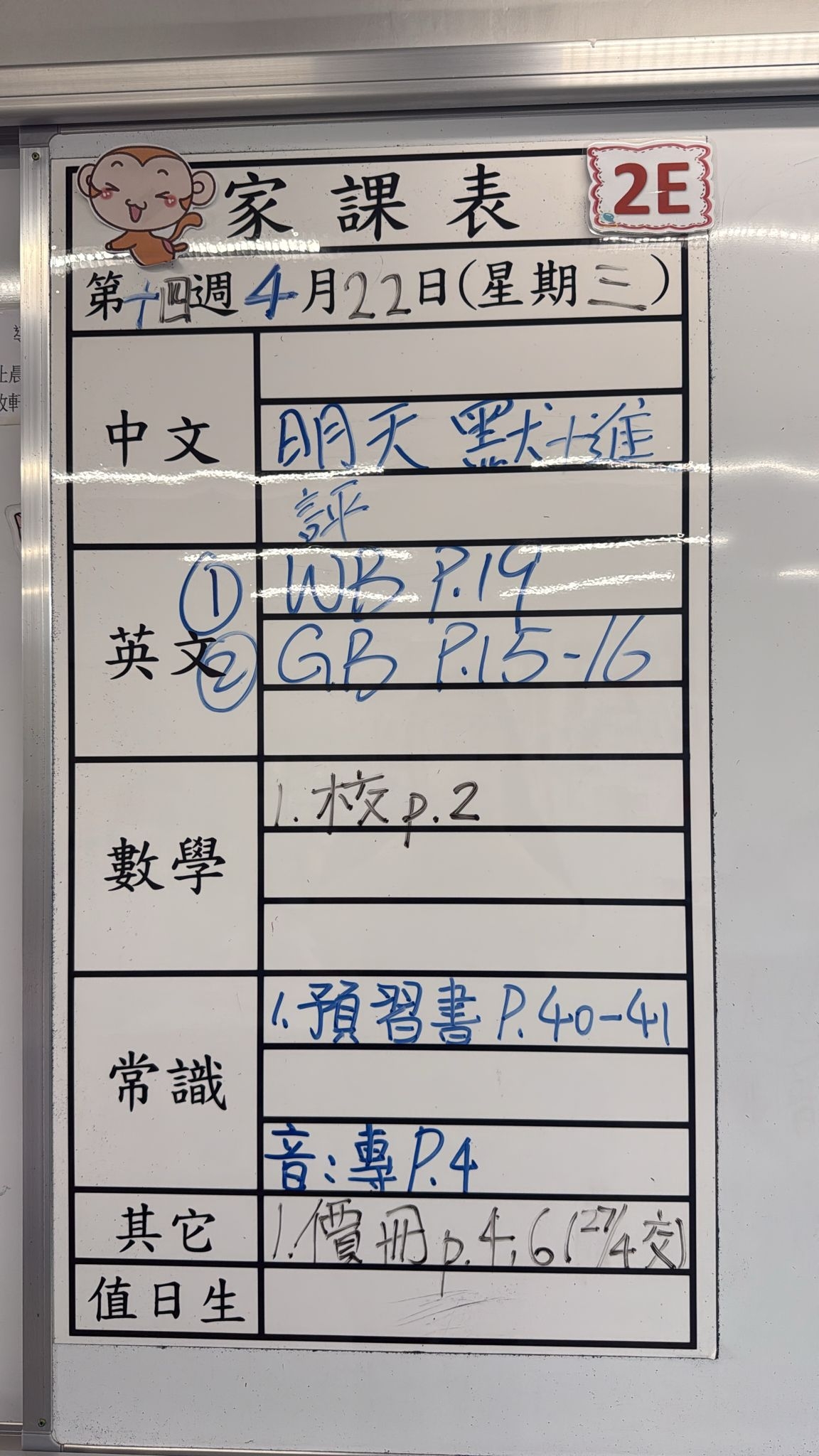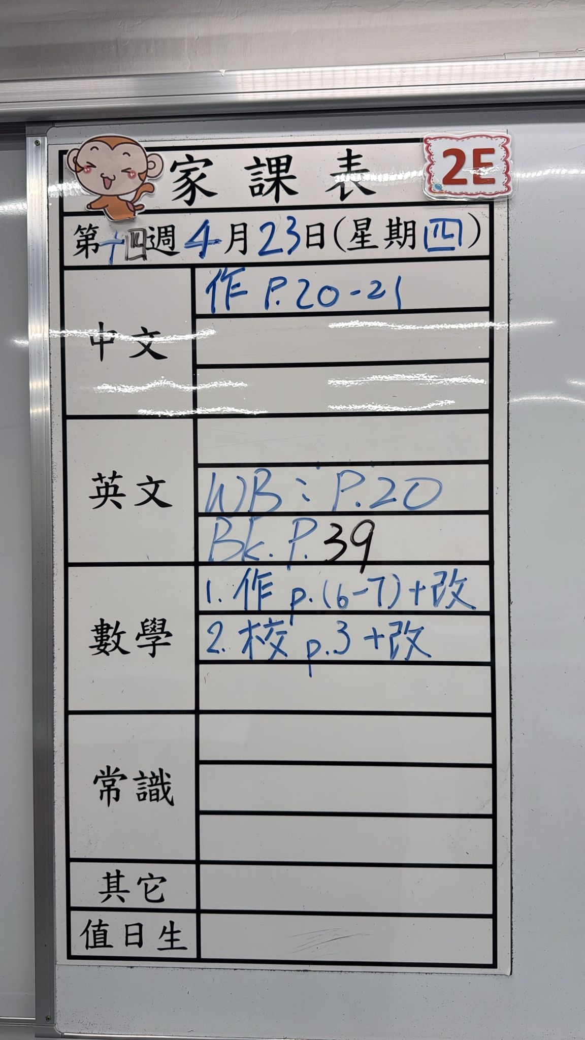 2026-04-22 週三發出之家課: